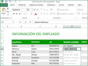 En Excel 2013, la nueva función Flash Fill rellena automáticamente rangos enteros de celdas seleccionadas. Excel analiza la tabla entera, detecta relaciones entre celdas y sugiere valores o textos. Excel también hace más sencillo crear tablas dinámicas y gráficos, generando sugerencias de forma similar. La nueva función de análisis rápido (Quick Analysis) de Microsoft Office Home Premium 2013 permite previsualizar algunas de las opciones de formato ya en la misma hoja de cálculo.